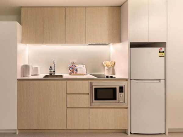 • Two-burner cooktop, microwave and kettle